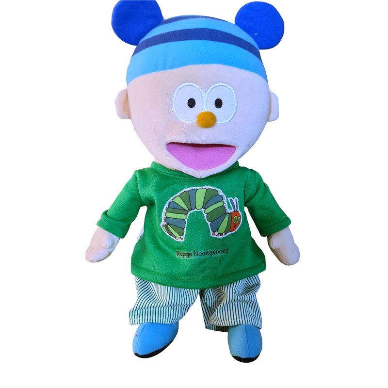 .Top in groen met lange mouwen , halsboordje en klittenband achtersluiting.Appplicatie Rupsje Nooitgenoeg op voorpand.Met naam Rupsje Nooitgenoeg in zwarte letters.Lange broek met groen wit streep motief; met fake gulp en elastische taiileband Excl. Pop en mutsje!( overige kleding accesoires apart verkrijgbaar!)Past ook Sil & Lis pop