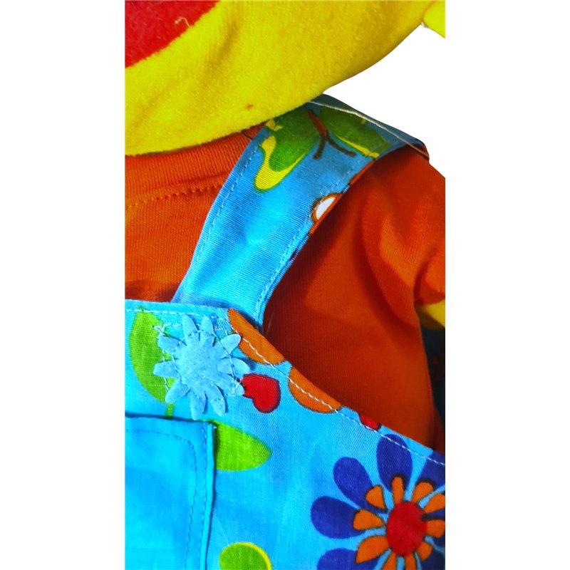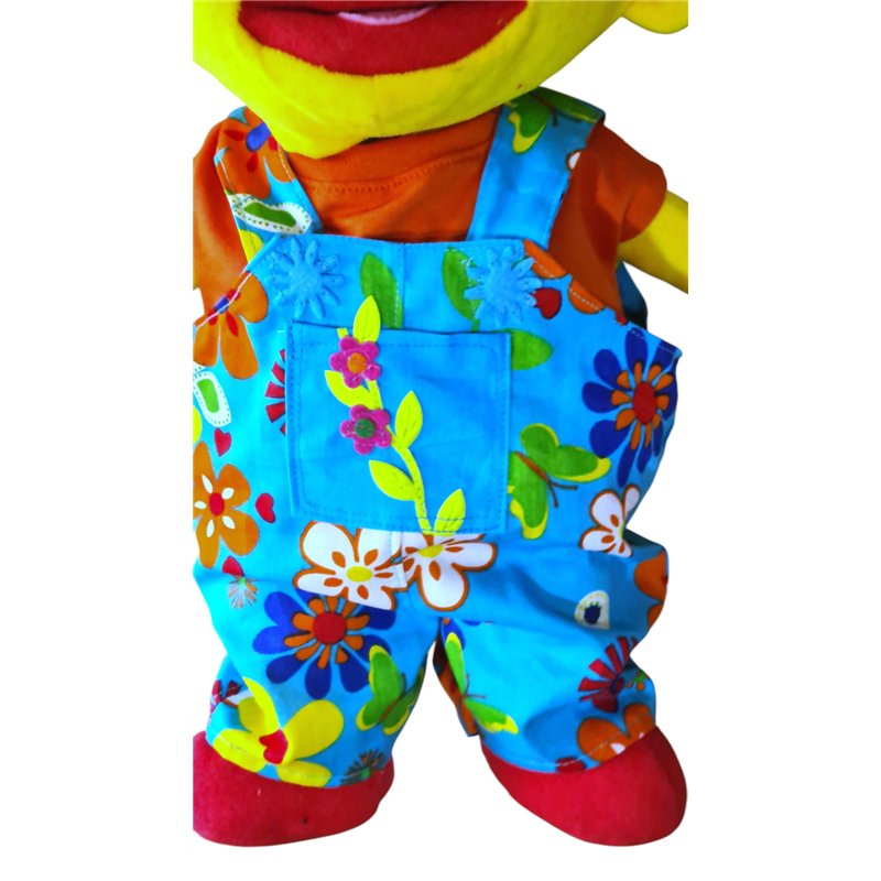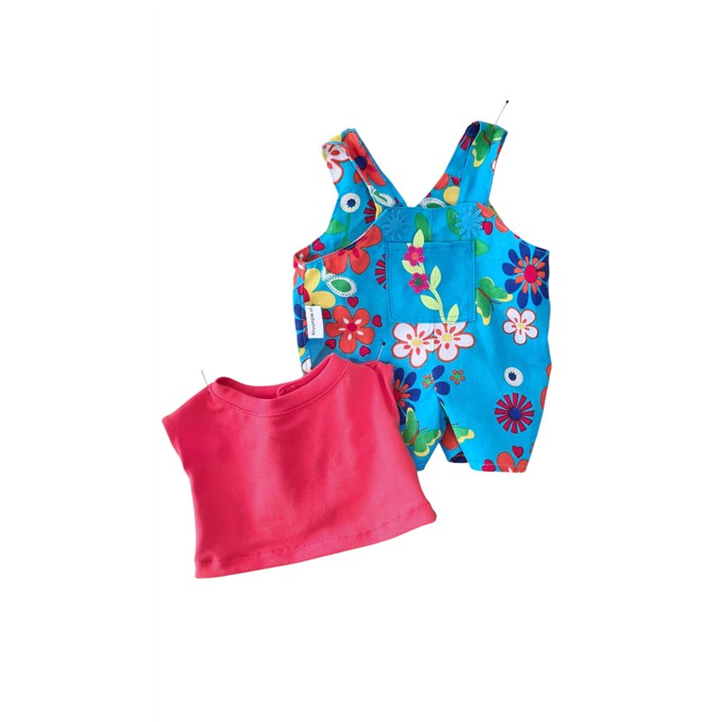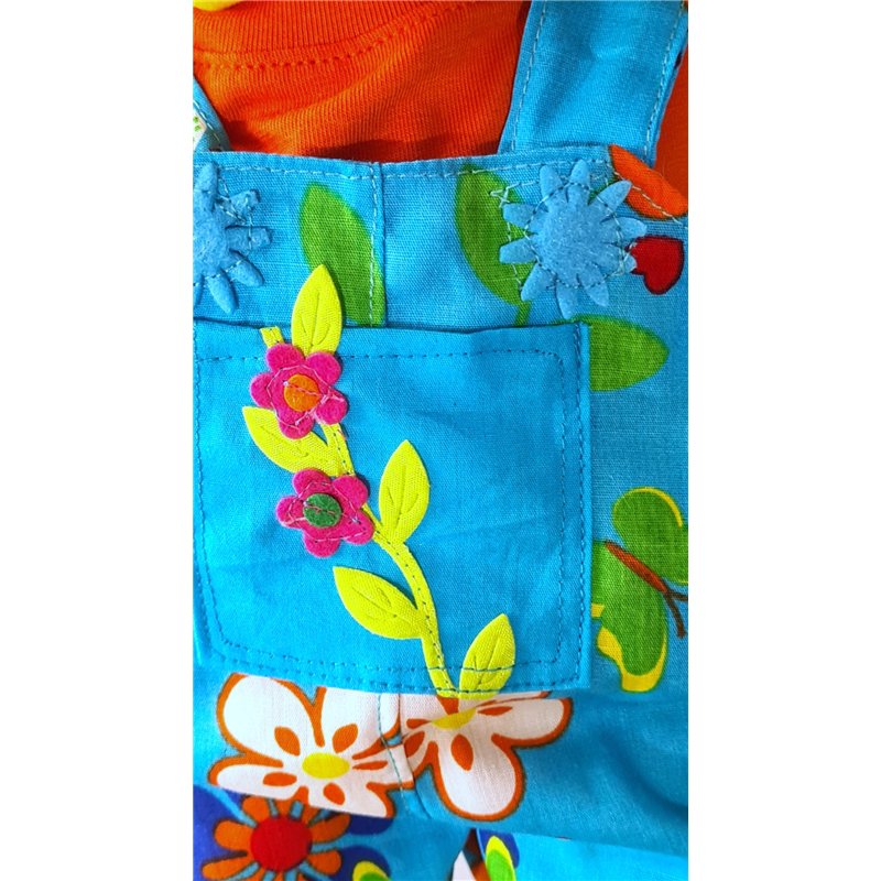 Tuinbroek in bloemen motief met schouderbanden. Sluit voor met klittenband en stoffen "knoopjes" Sluit met banden met klittenband voor. Stoffen"knoopjes".Zakje op bovenstuk met bladeren rankje en bloeiende bloemetjes.Dubbel boven en achterstukje.T- shirt met aangeknipt mouwtje. Halsboordje en klittenband achtersluiting