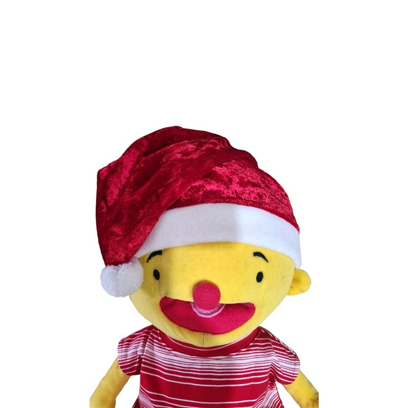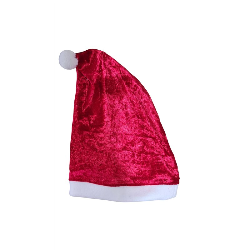 Kerstmuts van rode , glanzende pan velours. Met witte,dubbele rand van off white fleece.Pompoentje aan uiteinde. Excl overige kleding/accesoires en pop!