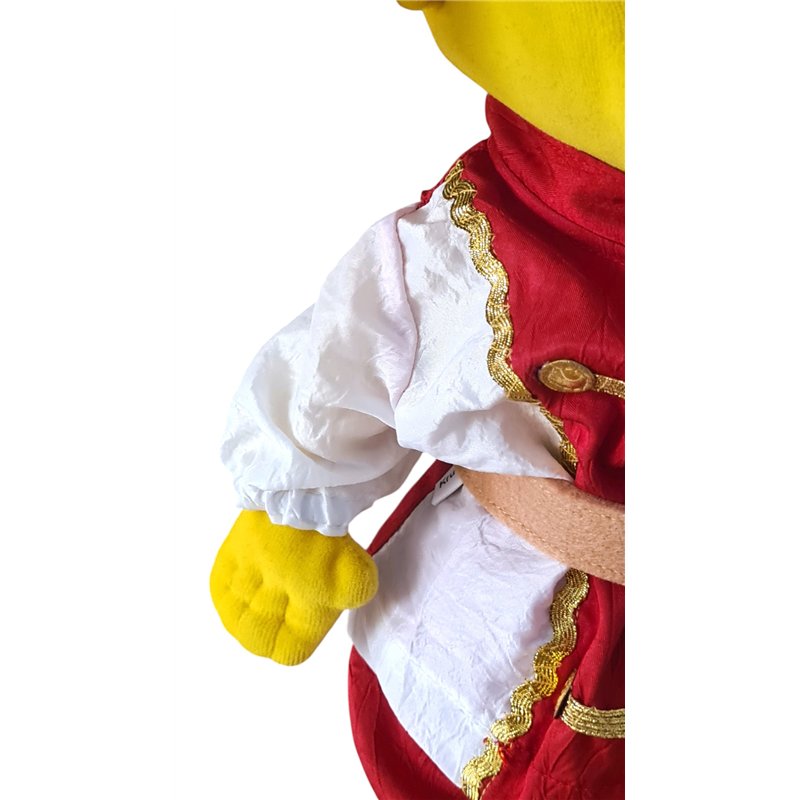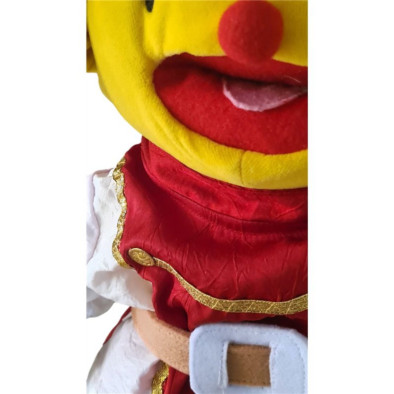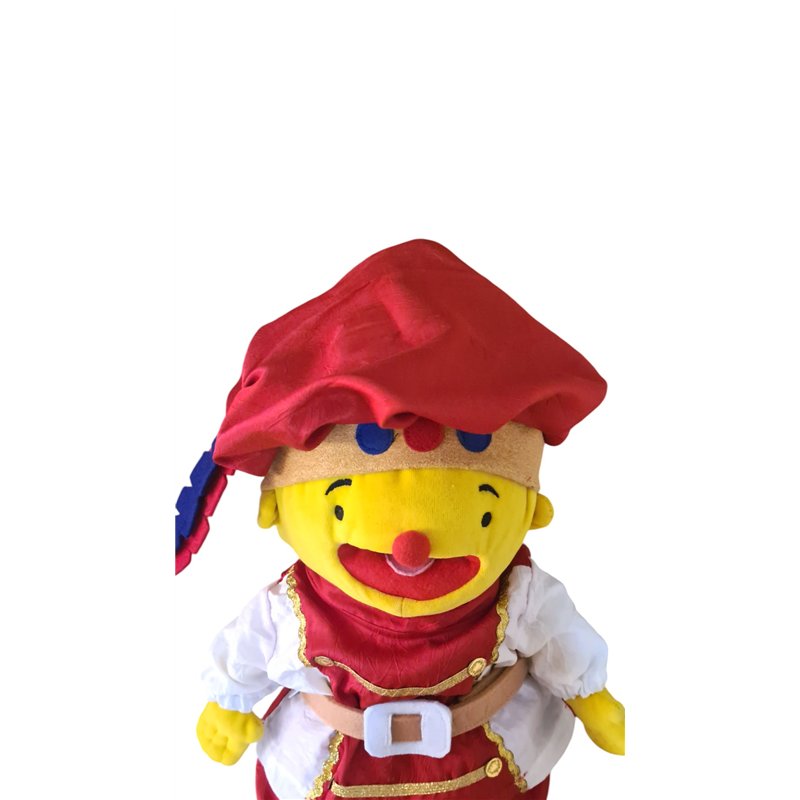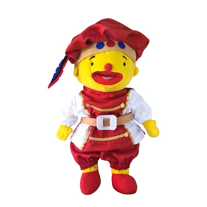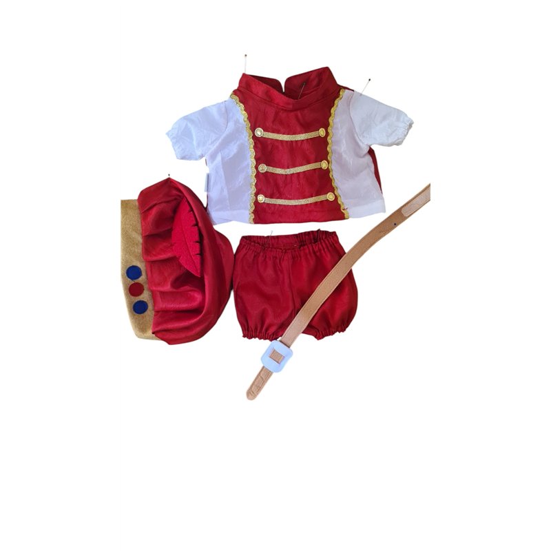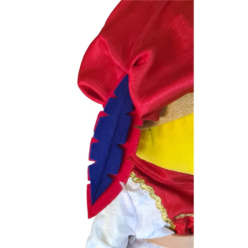 Pak gemaakt van mooie rode en witte krinkel taftzijde. Jasje in 2 kleuren. Met lange mouwen. Goudband en goudkleurige "knoopje"op voorpand. Rechtopstaans boordje. Sluit achter met klittenband. Vilten riem in beige vilt met witte dik vilten gesp; sluit met klittenband. Pofbroek met elastiek verwerkt in de pijpjes. Elastische taiileband. Prinsen muts met brede goudkleurige band met stoffen "juwelen"en dikke veer van vilt in 2 kleuren .