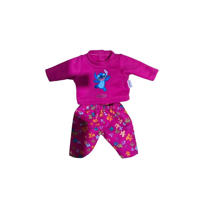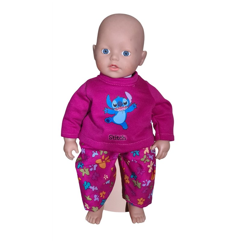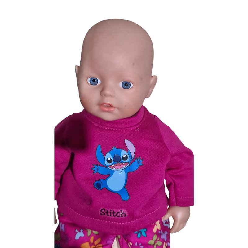 Top van tricot met lange mouwen. Halsboordje en klittenband achtersluiting.Applicatie stitch op voorpand met naam "stitch".Bijpassende lange broek met elastische taiileband en fake gulp. Excl. pop en evt. overige kleding/accesoires!