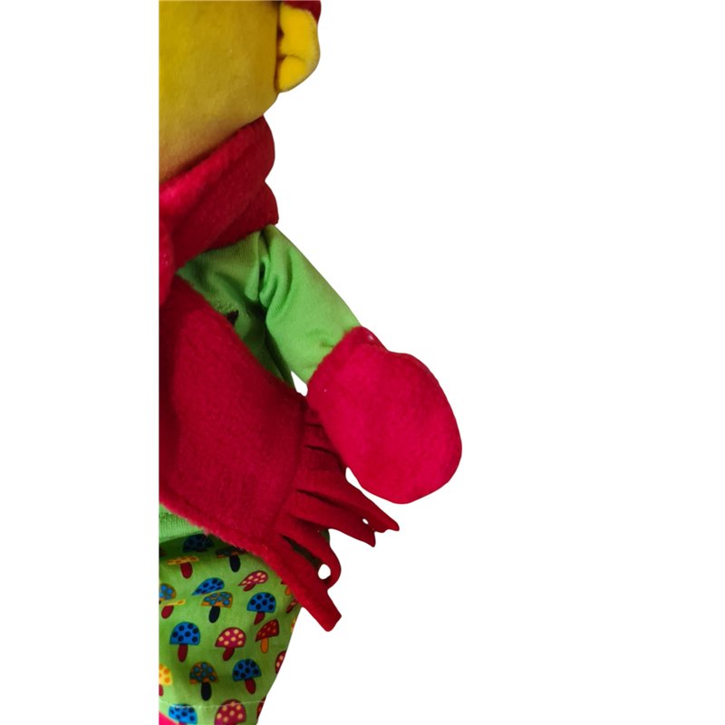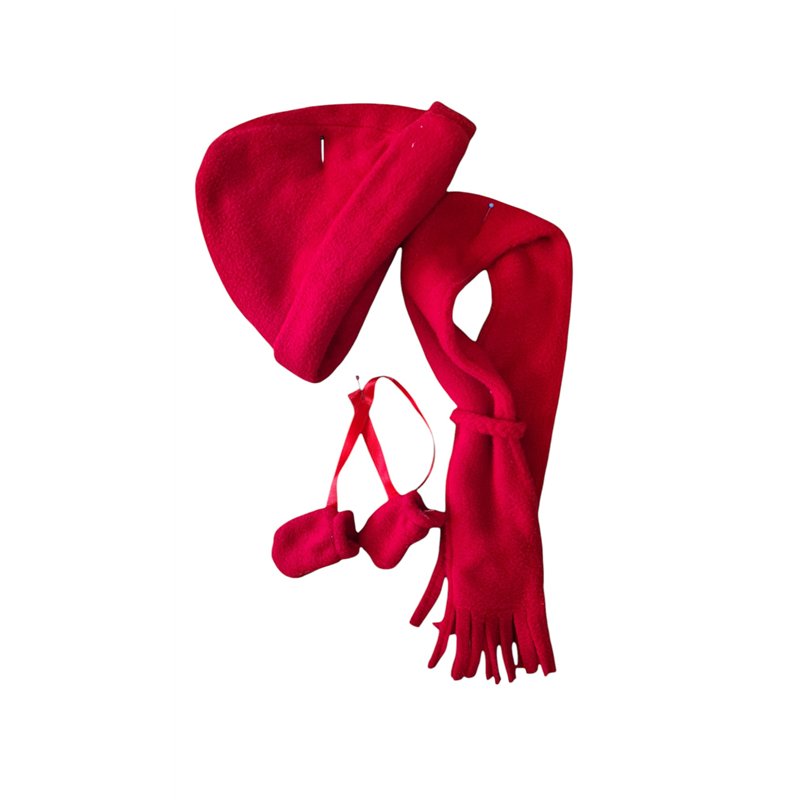Muts, sjaal & wantjes. Set van zachte fleece. Muts met omslag; gevoerd met tricot. Dubbele sjaal met "doorhaal"en franjes. Wantjes met elastiek in polsjes en anti-verlies lint. Excl. overige kleding en pop!)