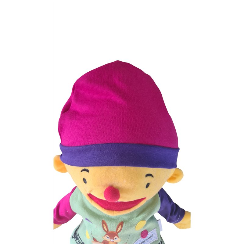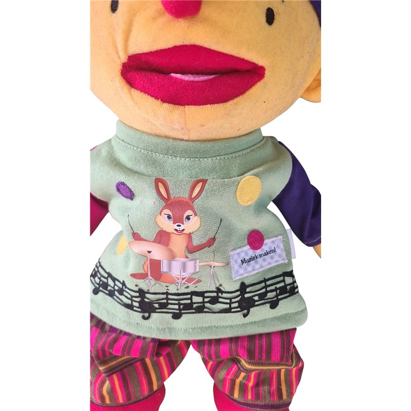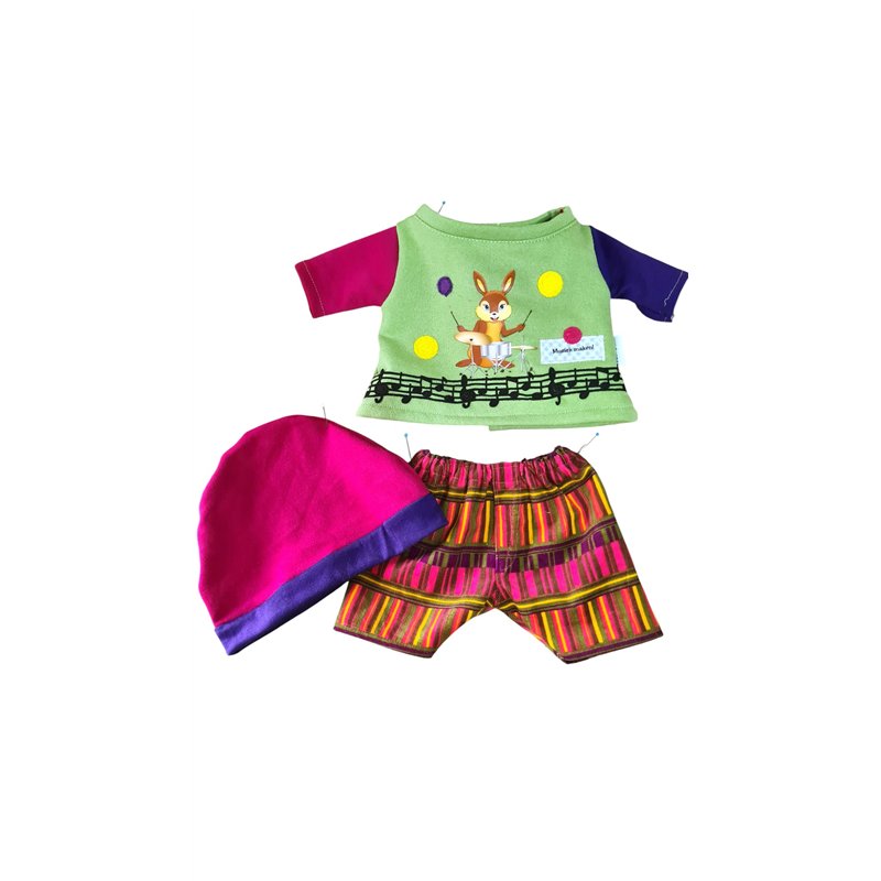1 op voorraad. Top in 4 kleuren met applicatieprint muziek dier. Band met muzieknoten langs de onderzijde. Tekst : muziek maken op voorpand.Lange broek in bijpassend stofmotief met fake gulp en elastische taiileband. Mutsje in 2 kleuren, met band. Excl. Pop!