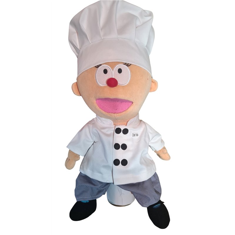 3 dlg Koks pakje. Jasje met overslag en opstaand boordje.Klittenband voorsluiting met dubbele rij knopen. Naam "Chef Kok" op voorpand. Lange blauw/wit geblokte broek met "Gulp"en elastische taiileband .Hoge koksmuts met brede hoofdband. Excl. Pop!( overige kleding accesoires apart verkrijgbaar!)Past ook Sil & Lis pop