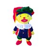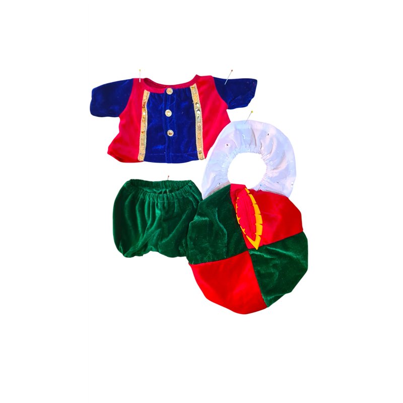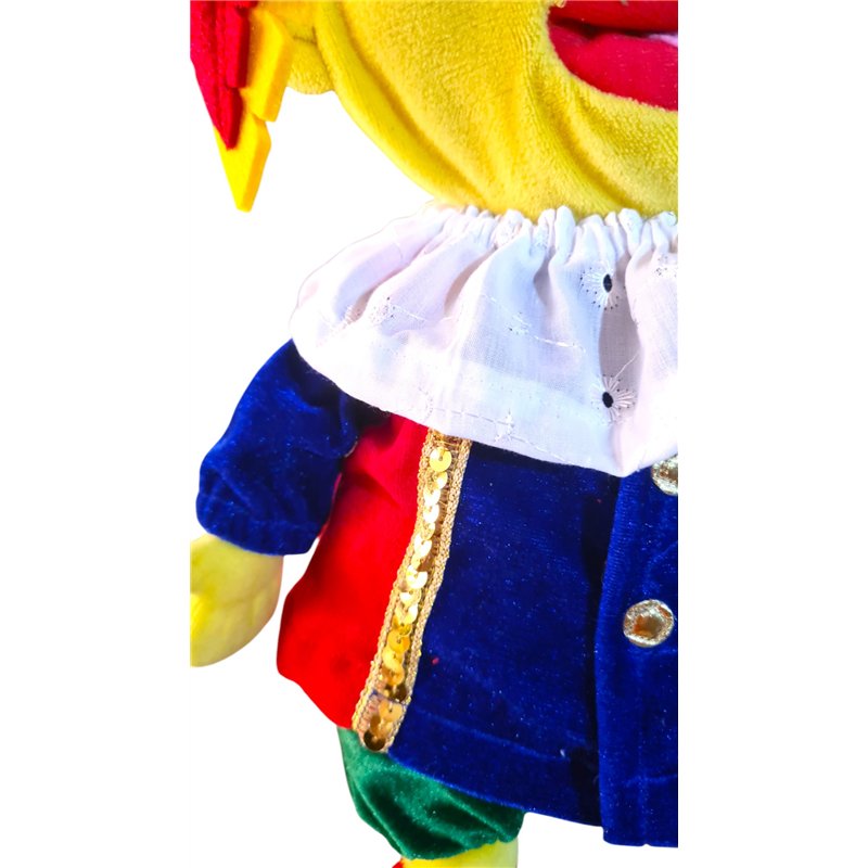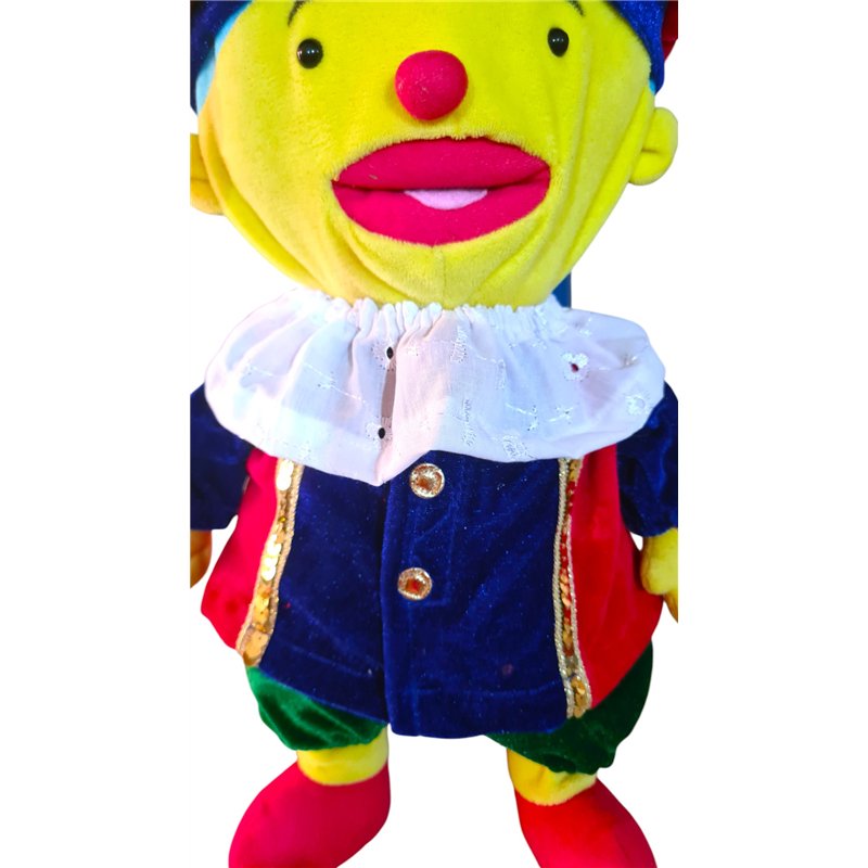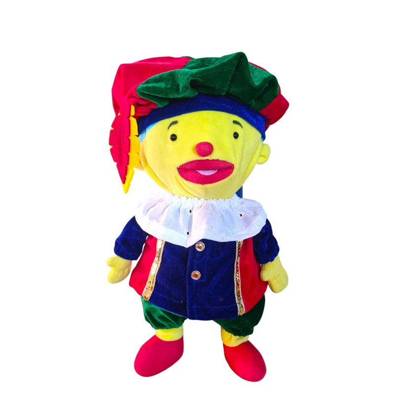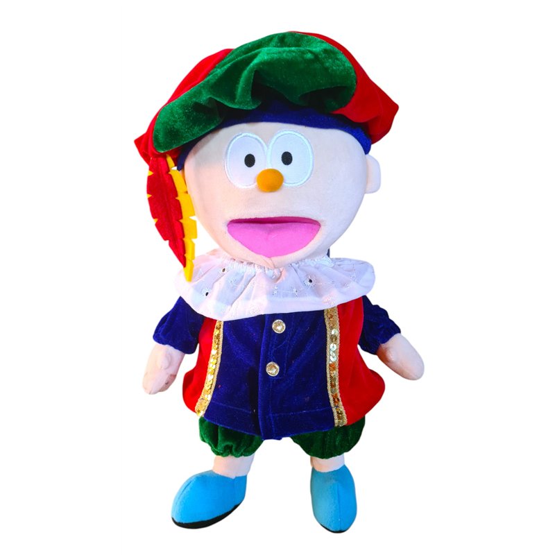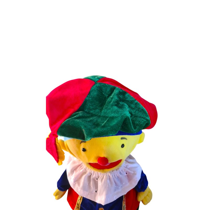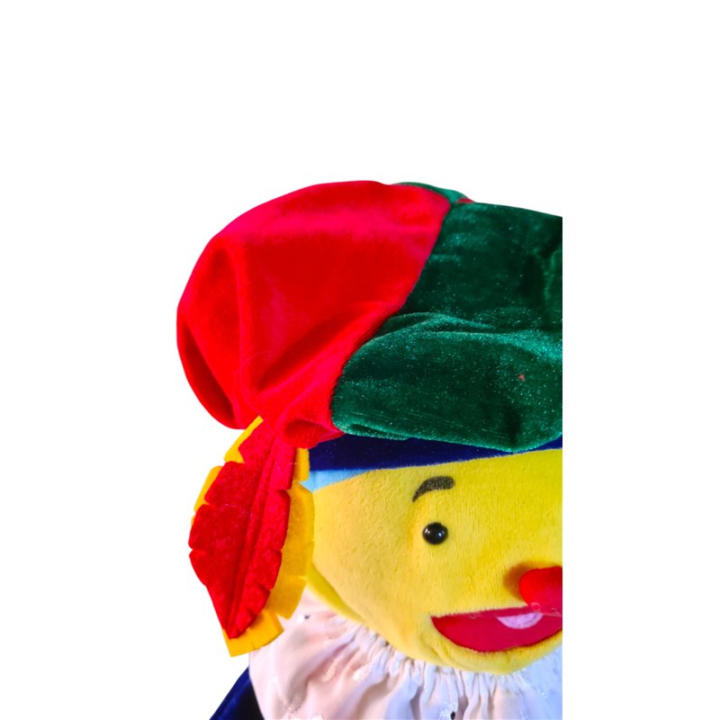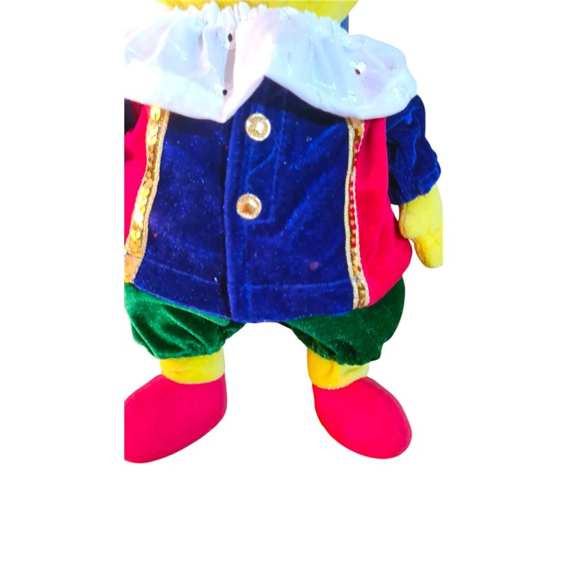 Zeer gedetaiileerd 4 dlg zwarte piet pak bestaat uit: Effen top van pan-fluweel in rood/donkerblauw,met klittenband voorsluiting met goudkleurige stoffen knoopjes . Afgezet met geel lovertjes/zigzag-band . Effen,donkergroen panne-fluweel pofbroekje met elastische taille en pijpjes . Donkergroene pan-fluwelen pet met elastiek en vilten veer. Witte elastische kraag.Excl. pop