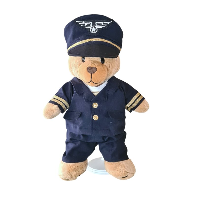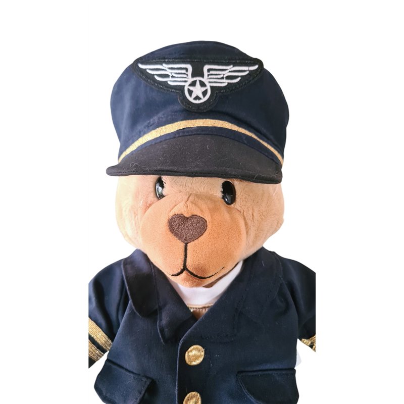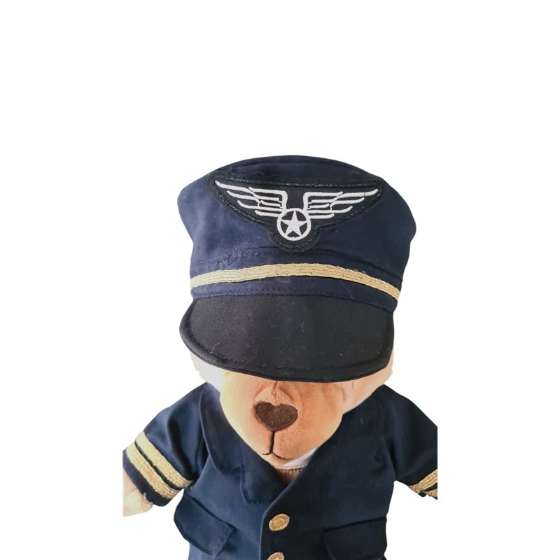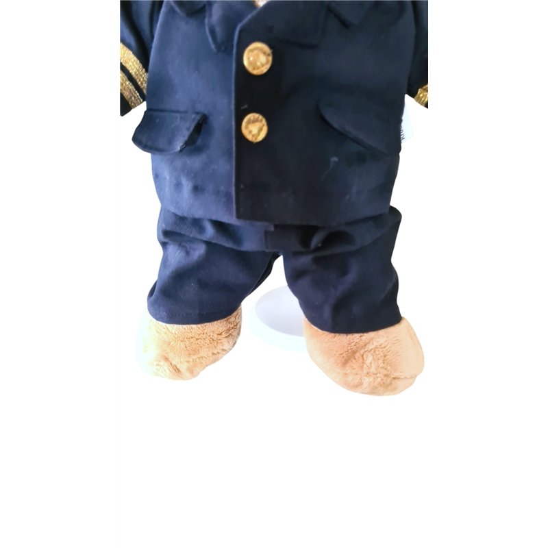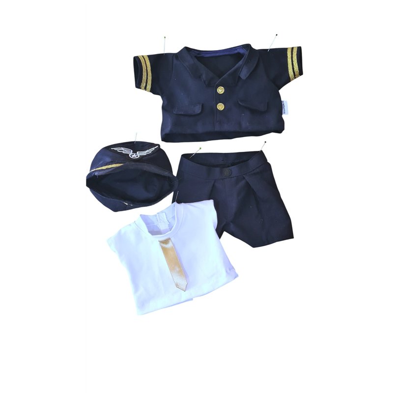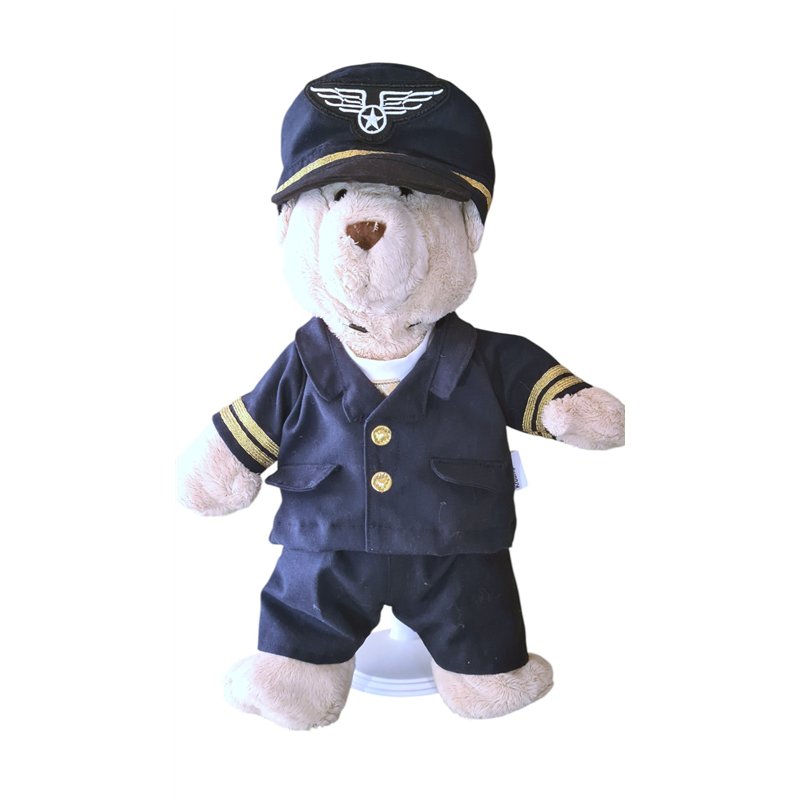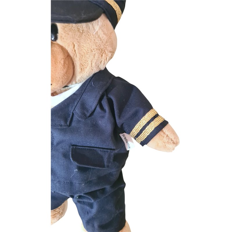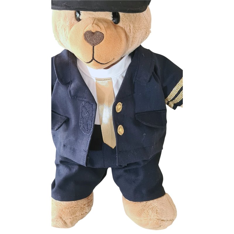 Past bij Thema "KIki vliegt'. Zeer gedetaiileerd!Effen donkerblauwe lange broek met fake gulp en elastische taiileband.Donkerblauw uniformjasje met revers en zakklepjes.Goudkleurige strepen op de mouwen. Sluit voor met klittenband en goudkleurige stoffen "knoopjes". Top met aangeknipte mouwe en stropdasje van satijnband. Sluit achter met klittenband Donkerblauwe, geheel gevoerde pet met luchtvaart embleem. Zwarte klep. Excl. beer.