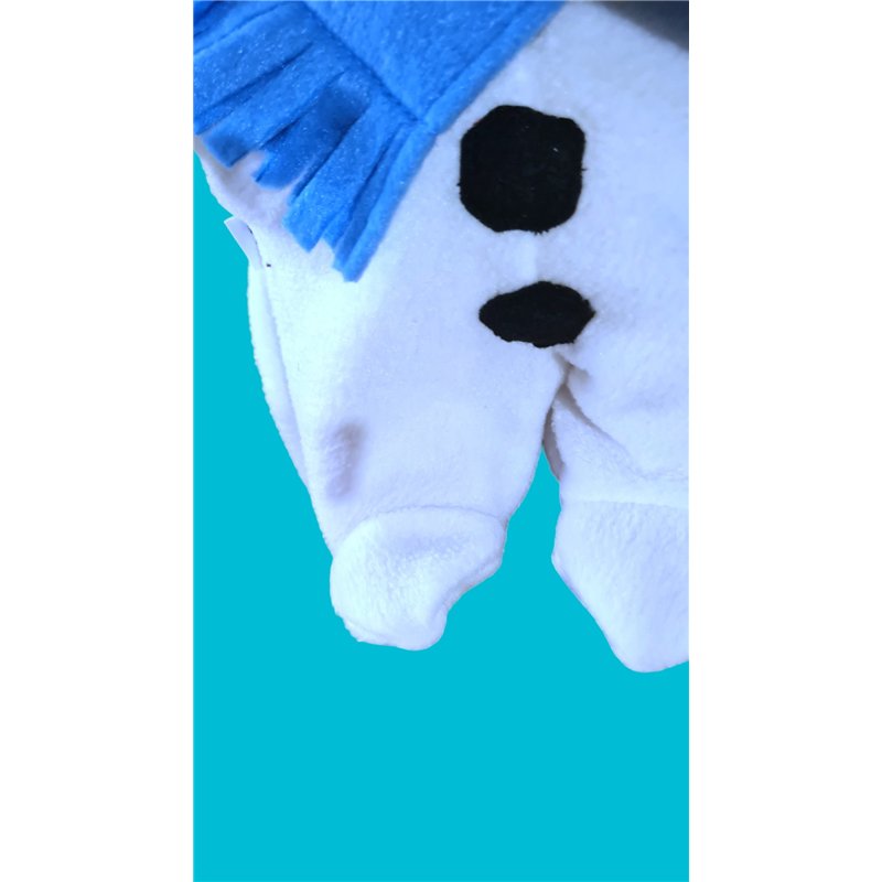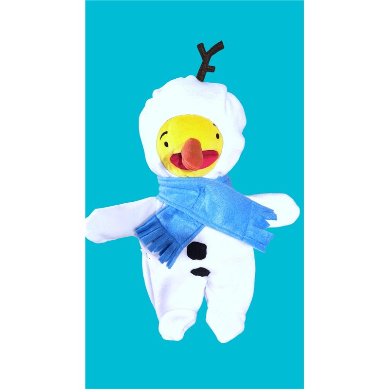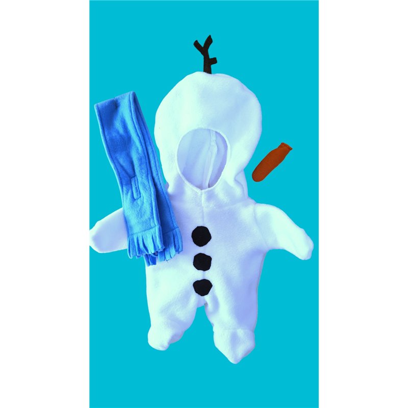 3 dlg sneeuwpop pak. Bestaat uit Sneeuwpop pak van witte fleece met veel details. Zeer gedetaileerd en arbeidsintensief.Pak uit 1 deel met sneeuwpop hoofd met takje bovenop. Met "voetjes : en "handjes" Sluit achter met klittenband. Voor zwarte "Kooltjes"van vilt. . Sluit voor met klittenband.Met wortel van stof als neus ( past met elastiek om huidige neus. Sjaal met klittenband voorsluiting en franjes