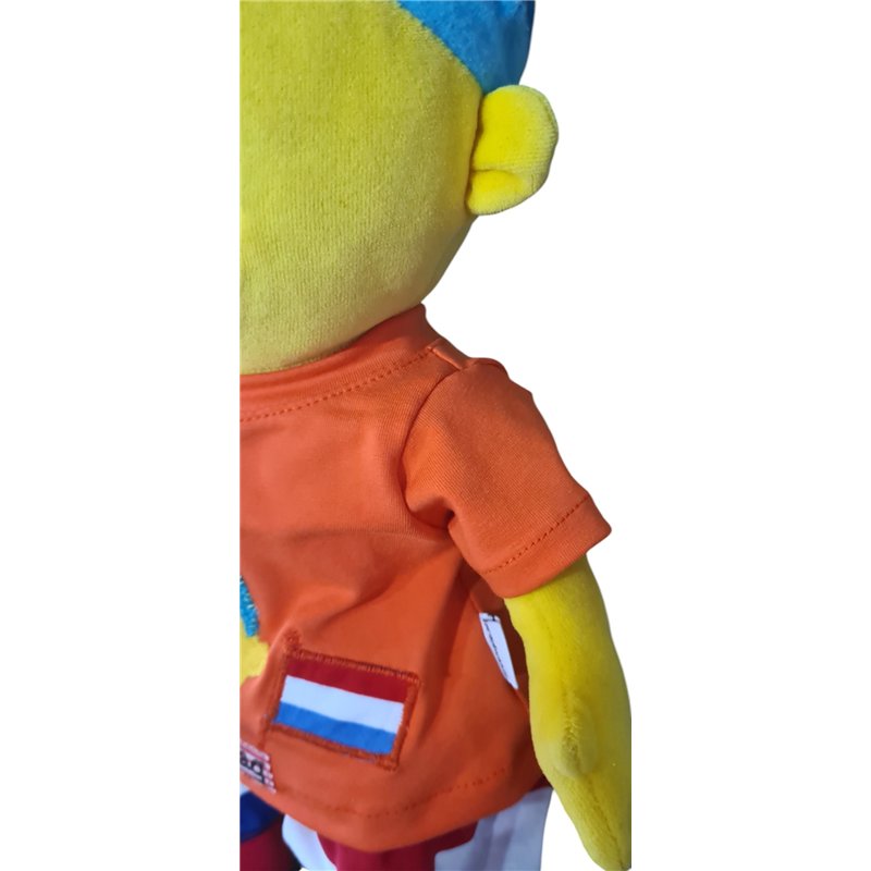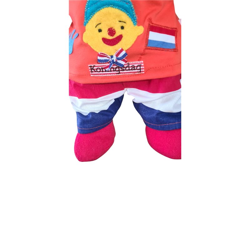 2 dlg bestaat uit: Effen oranje top van rekbare stof met korte mouwen. Volledig handgemaakte applicatie Puk ( zeer arbeidsintensief!) op voorpand met vlag, kroon en tekst "koningsdag"Lange broek met oranje bovenkant en de 3 kleur van de vlag op de pijpen , fake gulp . Elastische taiileband.Evt. overige kleding/accesoires apart verkrijgbaar.Excl. pop.