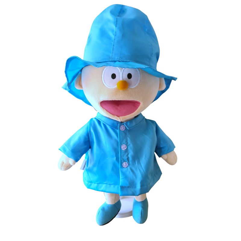 2 dlg regen jas set. Gevoerde regenjas van waterafstotende stof. Met kraagje en klittenband voorsluiting met stoffen "knoopjes". Zuidwester pet .Met brede rand. Geheel gevoerd! Excl. broek en Pop!